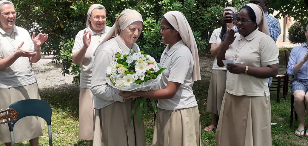 La Domenica è iniziata con le Lodi e la S. Messa tutti assieme, poi la giornata è stata fondamentalmente "libera", da gestire personalmente. Avevamo invitato Sor. Gemma Consolaro per festeggiare con lei i 60 anni di vita religiosa, approfittando che, tra le Sorelle capitolari, sei erano state sue novizie. Sor. Gemma è venuta nella mattinata accompagnato dal nostro caro Carlo Girotti e la moglie Clara. Abbiamo festeggiato tutti assieme fuori in giardino, con il pranzo preparato da un'equipe di Fratelli e Sorelle, dando cosí un pó di riposo ai cuochi dell'Abbazia. Nel pomeriggio Sorelle e Fratelli si sono turnati nell'' Adorazione Eucarística concludendo con un tempo di preghiera a suffragio e facendo memoria di tutte le Sorelle e Fratelli che ci hanno preceduto nel cammino verso la santità. Per questo abbiamo pregato camminando verso il cimitero. Si è unito a noi anche il Vescovo di Salto il quale, dopo essere stato a S. Zeno in Monte per visitare la tomba di S. Giovanni Calabria, ha desiderato portare i saluti anche ai Capitolari.